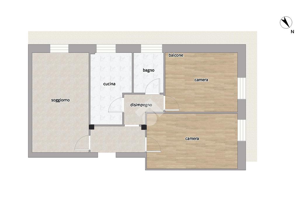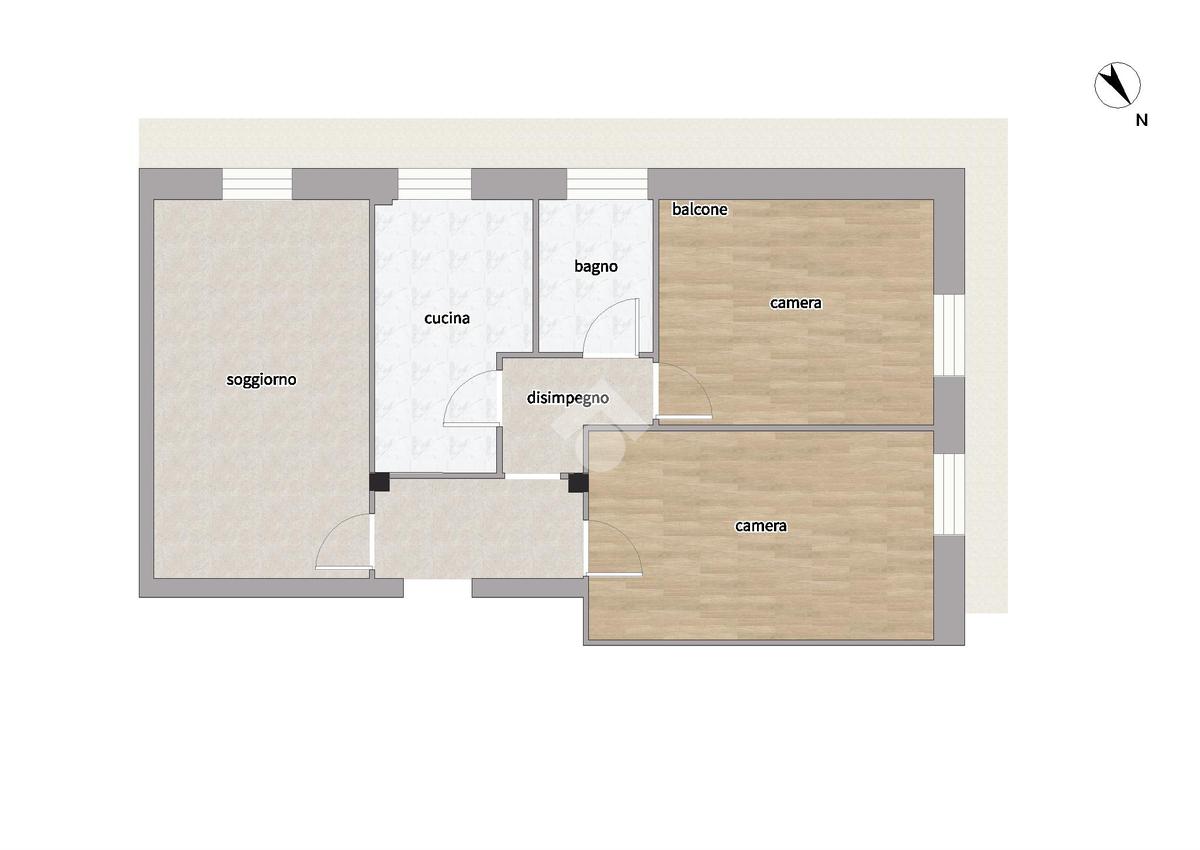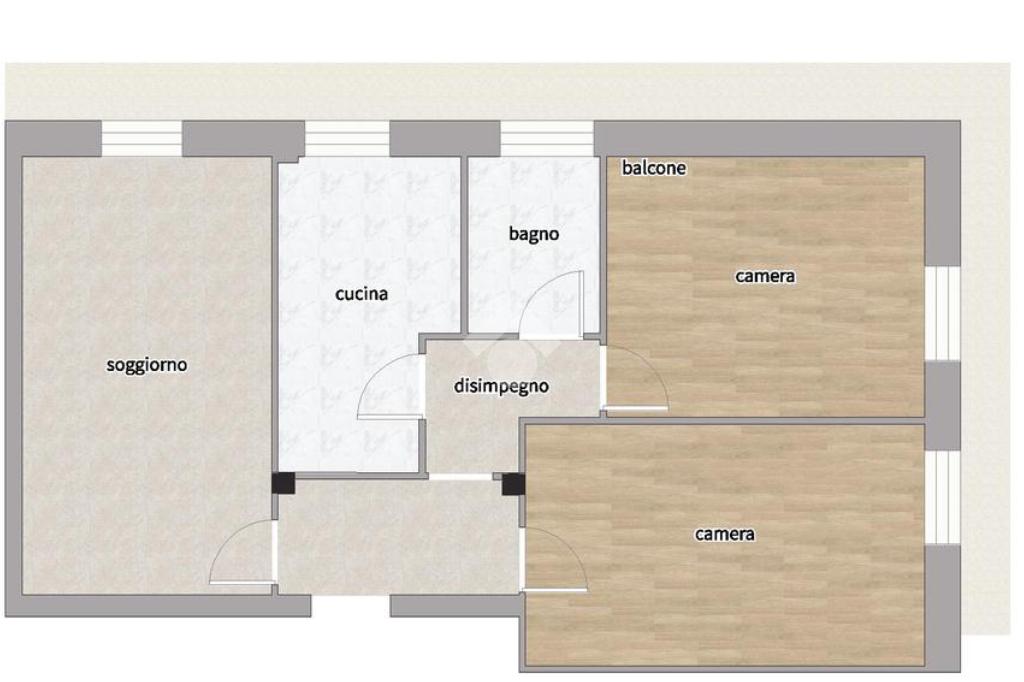 L’immobile è composto da ingresso, soggiorno, cucina abitabile, due camere da letto, bagno e un balcone angolare, con accesso da tutte le stanze.